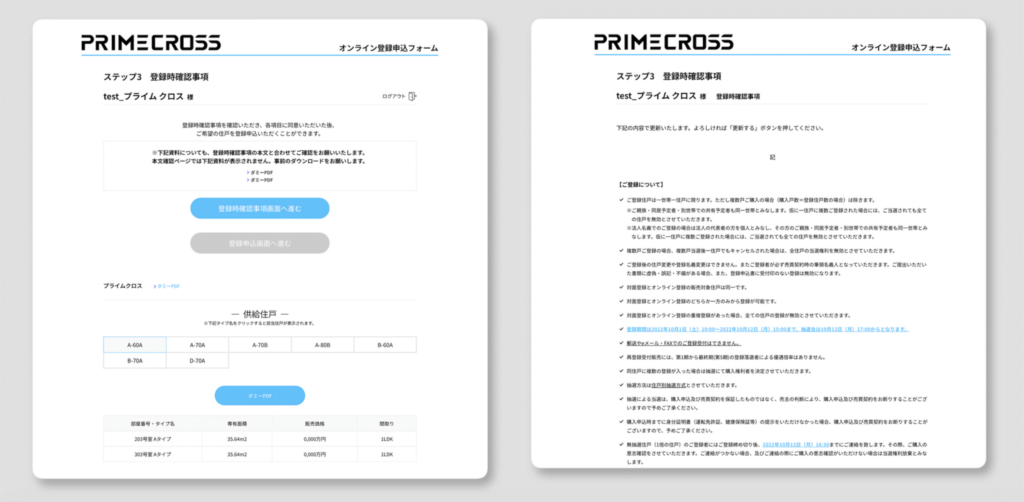 これらの機能がプライムクロスに評価され、プライムクロスの新築分譲住戸販売会社向け「オンライン登録システム」の基盤サービスとして採用されました。